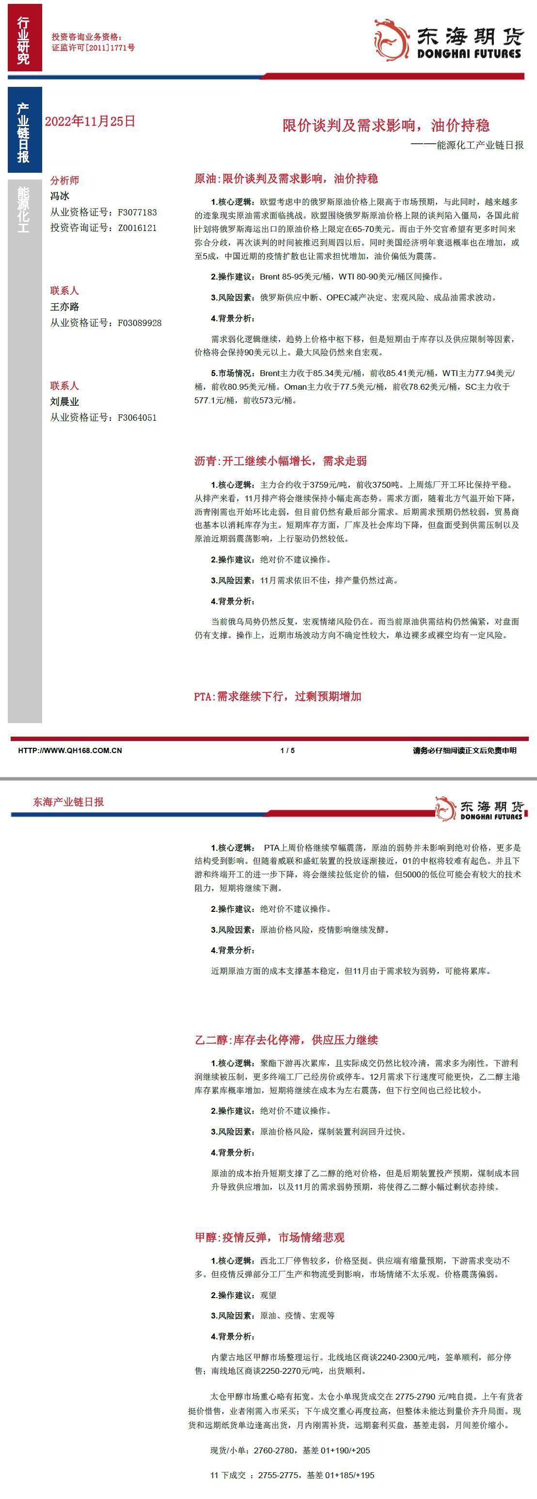 *标题:【东海期货11月25日产业链日报】能化篇:限价谈判及需求影响,油价持稳*